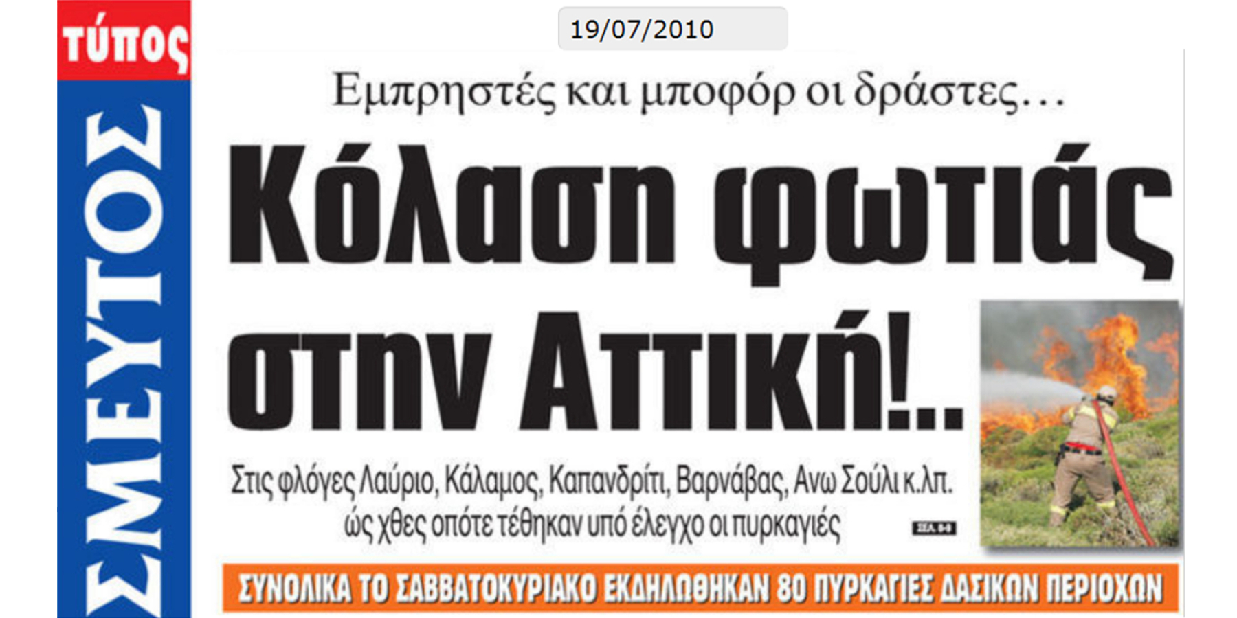ΕΠΕΙΔΗ ΤΑ ΚΑΘΕΣΤΩΤΙΚΑ ΜΜΕ ΚΑΙ ΤΟ ΚΟΜΜΑΤΙΚΟ ΑΝΘΕΛΛΗΝΙΚΟ ΚΑΤΕΣΤΗΜΕΝΟ, ΒΡΙΣΚΟΥΝ ΧΙΛΙΑΔΕΣ ΔΟΛΙΟΥΣ ΤΡΟΠΟΥΣ ΝΑ ΚΑΝΟΥΝ ΤΟΥΣ ΕΛΛΗΝΕΣ ΠΟΛΙΤΕΣ, ΝΑ ΞΕΧΝΟΥΝ ΤΙ ΤΟΥΣ ΕΧΕΙ ΣΥΜΒΕΙ, ΓΙΑΥΤΟ ΑΠΟ ΤΗΝ ΤΕΛΕΥΤΑΙΑ ΜΟΝΟ ΕΝΔΕΚΑΕΤΙΑ, ΘΑ ΠΡΕΠΕΙ ΝΑ ΘΥΜΗΘΟΥΜΕ ΕΝ ΣΥΝΤΟΜΙΑ ΤΙ ΕΧΕΙ ΣΥΜΒΕΙ ΜΕ ΤΙΣ ΠΥΡΚΑΓΙΕΣ ΣΤΗΝ ΧΩΡΑ ΜΑΣ ΒΛΕΠΟΝΤΑΣ ΤΙΣ ΠΑΡΑΚΑΤΩ ΦΩΤΟΓΡΑΦΙΕΣ ΜΕΡΙΚΩΝ ΕΝΔΕΙΚΤΙΚΩΝ ΠΡΩΤΟΣΕΛΙΔΩΝ ΕΦΗΜΕΡΙΔΩΝ..